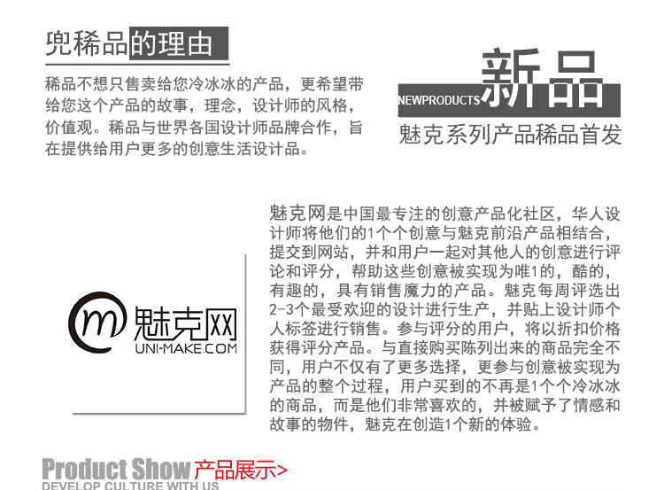魅克网是中国最专注的创意产品化社区,华人设计师将他们的个个创意与魅克前沿产品相结合,提交到网站,并和用户一起对其他人的创意进行评论和评分,帮助这些创意被实现为唯1的,酷的,有趣的,具有销售魔力的产品。魅克每周评选出2-3个最受欢迎的设计进行生产,并贴上设计师个人标签进行销售。参与评分的用户,将以折扣价格获得评分产品。与直接购买陈列出来的商品完全不同,用户不仅有了更多选择,更参与创意被实现为产品的整个过程,用户买到的不再是个个冷冰冰的商品,而是他们非常喜欢的,并被赋予了情感和故事的物件,魅克在创造个新的体验。